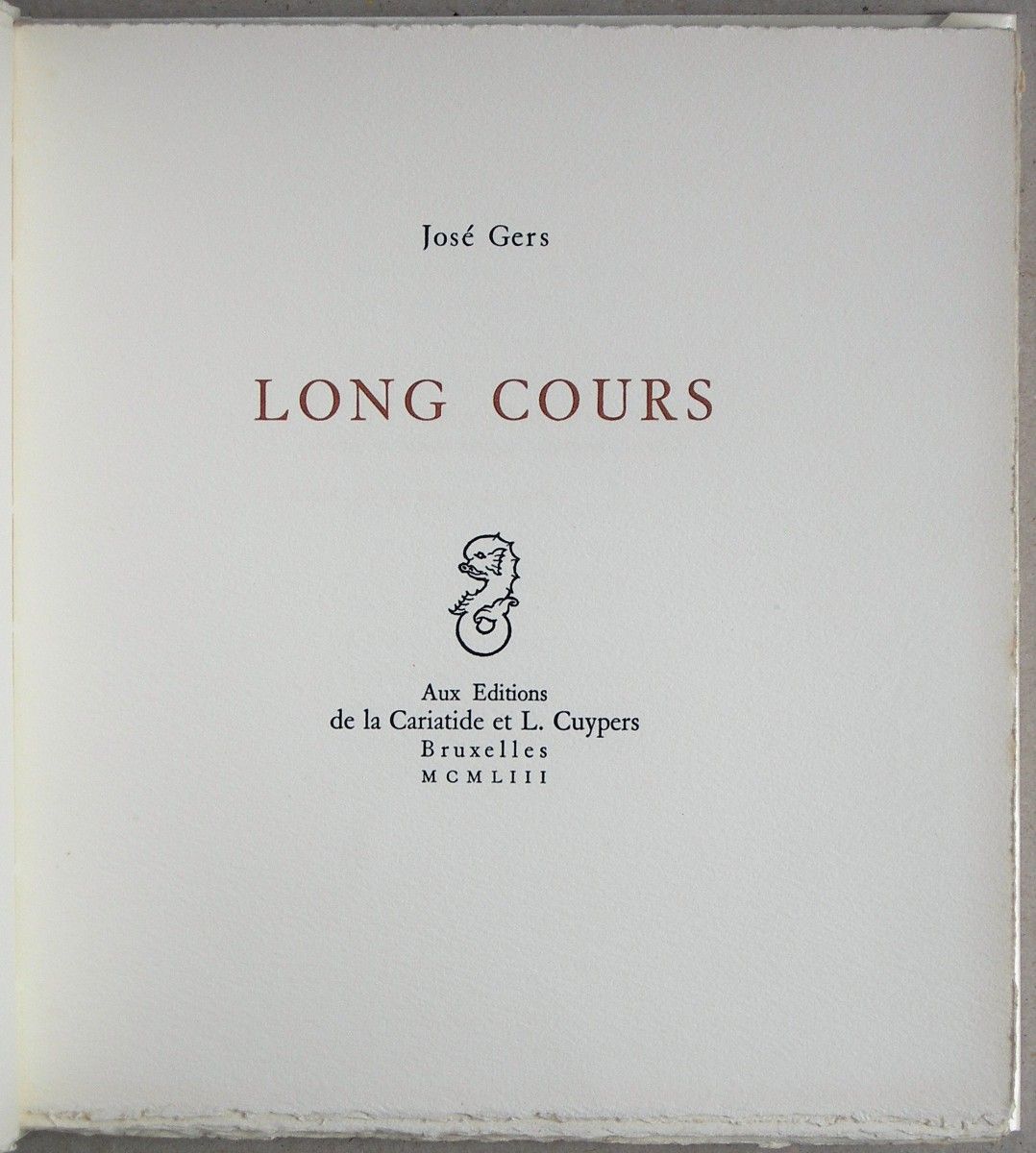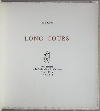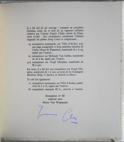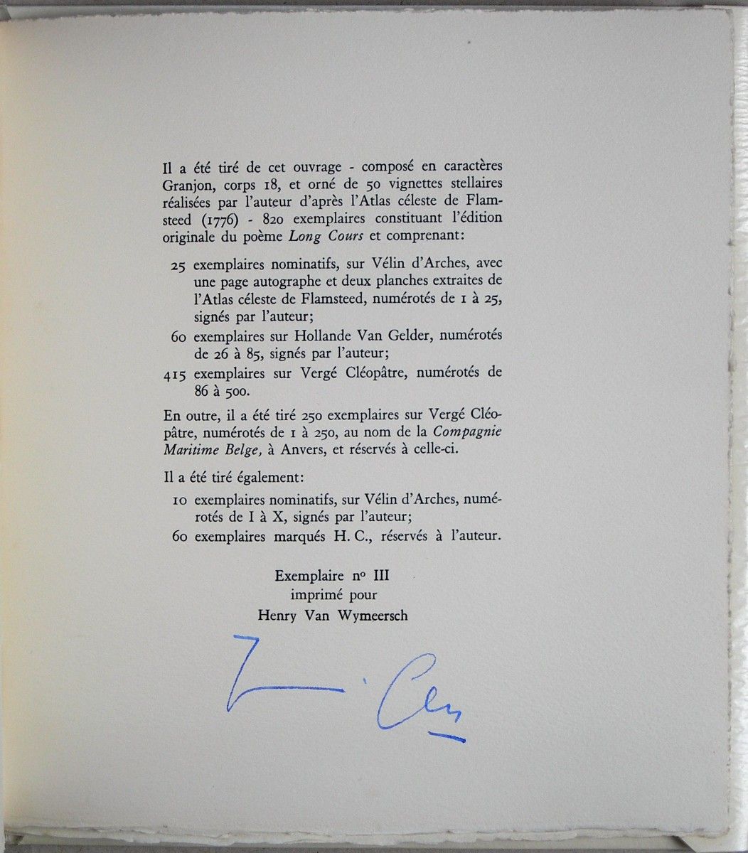 Long Cours. 10 exemplaires nominatifs, sur vélin d’arches numérotes de I á X, signes par l’auteur. Exemplaire no. III imprimé pour Henry van Wymeersch.
