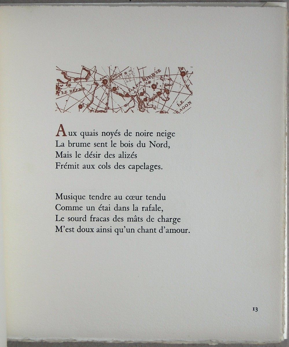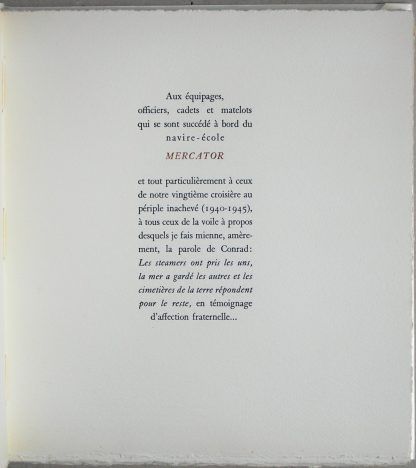 Edition originale de ce recueil de poésies marines, orné de 50 “vignettes stellaires réalisées par l’auteur d’après l’Atlas céleste de Flamsteed (1776)”. Exemplaire enrichi d’une dédicace de l’auteur “au baron Frédéric, à l’artiste, à l’ami”, de 2 cartes photos représentant le navire Mercator, avec quelques lignes manuscrites du poète, d’une petite carte réalisée à l’occasion de son décès. Ex-libris Georges Frédéric (Baron Georges Frédéric, peintre bruxellois, 1900-1981), avec également sa signature autographe.