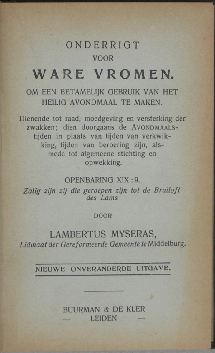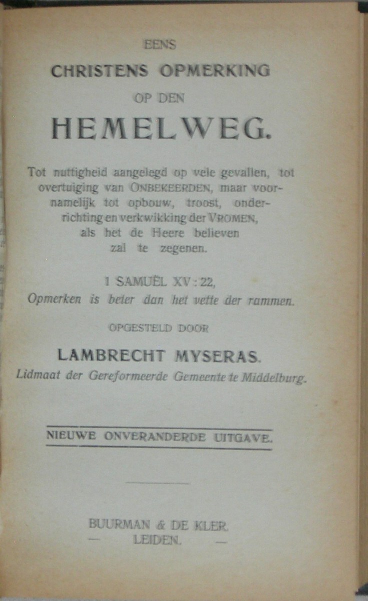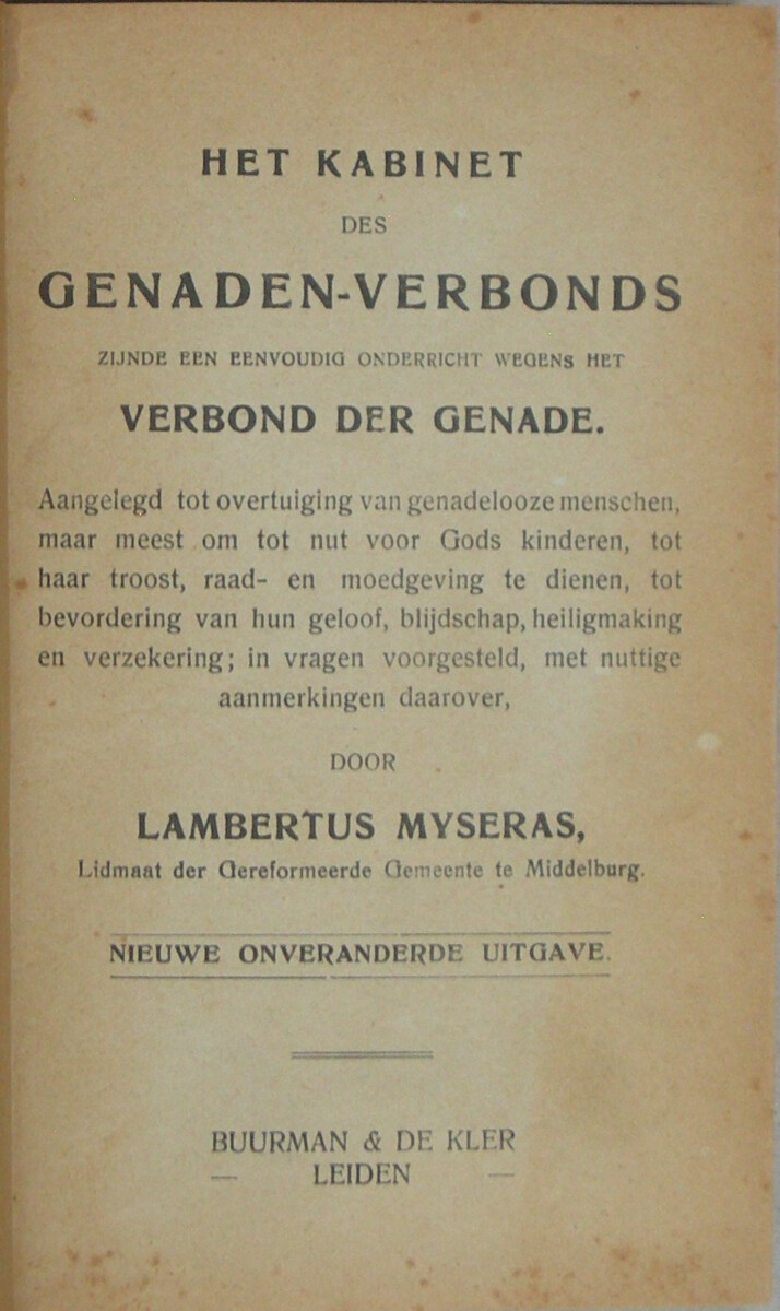 Al de werken van Lambertus Myseras: Het kabinet des genaden-verbonds / Onderrigt voor ware vromen om een betamelijk gebruik van het Heilig Avondmaal te maken / Eens Christen opmerking op den hemel weg / Der vromen ondervinding op den weg naar den hemel, voorgesteld in vragen en antwoorden / Het kinderdeel der vromen