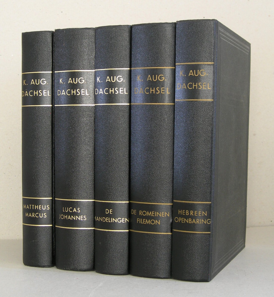 Nieuwe Testament in 5 delen. Gebonden. In het 2e deel regelmatig onderstrepingen, voor het overige een keurige set!