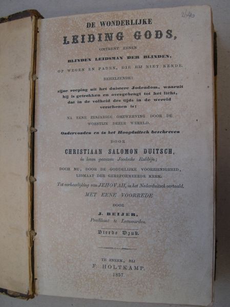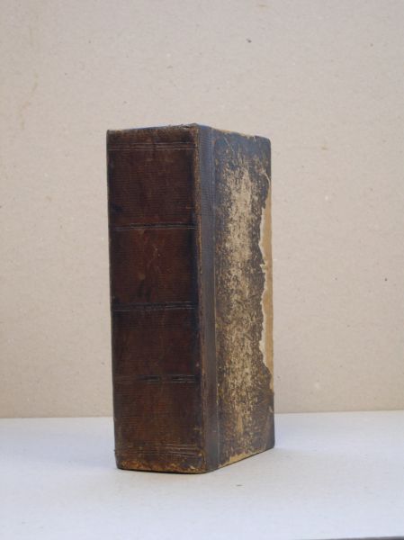 Gebonden in oude half-leren band. (voorste schutblad en het marmer op de platten gedeeltelijk weg).