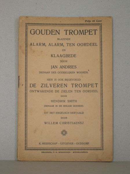 Gouden trompet blazende alarm, alarm, ten oordeel en klaagbede (…) Hier is ook bijgevoegd de zilveren trompet ontwakende de zielen ten oordeel door Hendrik Smith (…) Uit het Engelsch vertaald door Willem Christiaensz.
