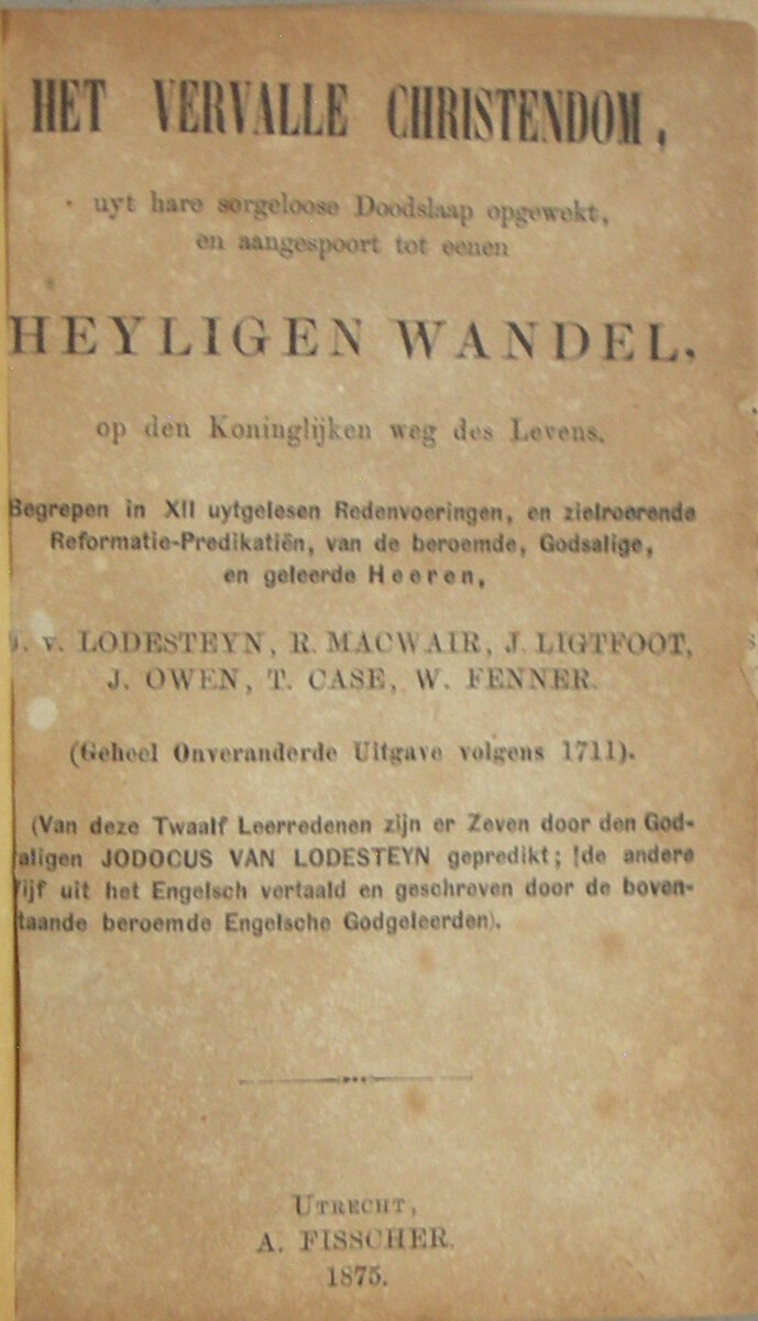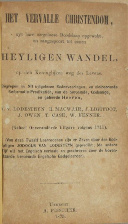 Het vervalle Christendom, uyt hare sorgelose Doodslaap opgewekt, en aangespoort tot eenen Heyligen Wandel, op den Koninglijken weg des Levens. Begrepen in XII uytgelesen Redenvoeringen, en zielroerende Reformatie-Predikatiën van de beroemde bovenvermelde Godsalige en geleerde Heeren, v. Lodesteyn, R. Macwair, J. Lightfoot, J. Owen, T. Case, W. Fenner. Onveranderde uitgave volgens 1711.