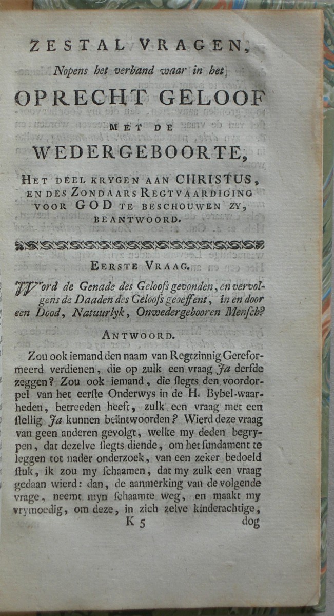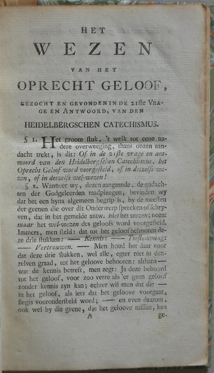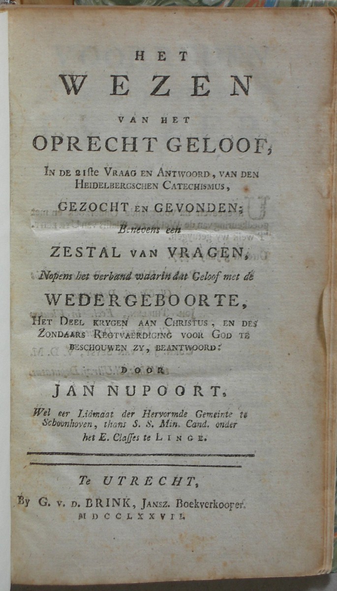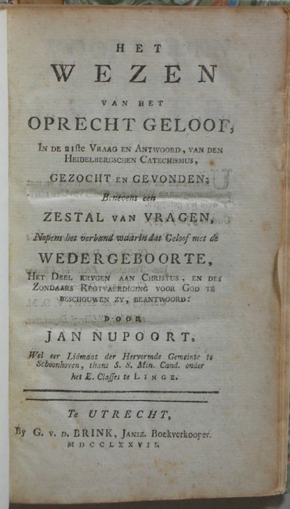 Het wezen van het oprecht geloof. In de 21e vraag en antwoord van den Heidelbergschen Catechismus gezocht en gevonden; benevens een zestal van vragen, nopens het verbond waarin dat geloof met de wedergeboorte, het deel kryen desgen aan Christus, en des zondaars regtvaerdiging voor God te beschouwen zy, beantwoord door Jan Nupoort (…)