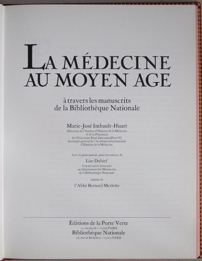 La médecine au Moyen Age à travers les manuscrits de la Bibliothèque nationale. Il a été tiré 20 exemplaires numérotés de I a XX, reliés par la Reliure d’Art du Centre à Limoges qui constituent l’ édition originale XI.