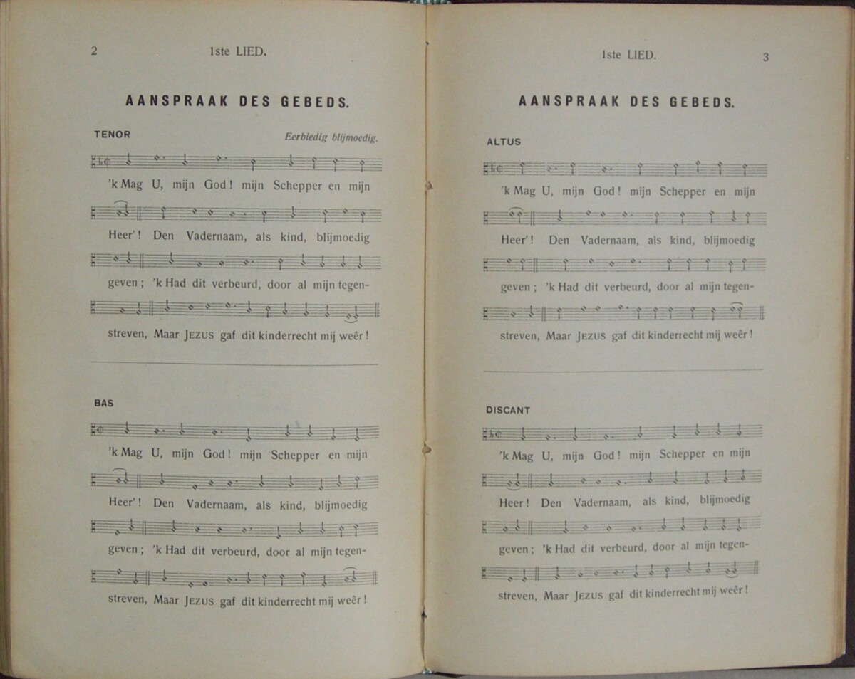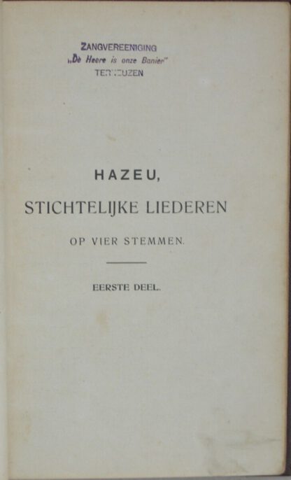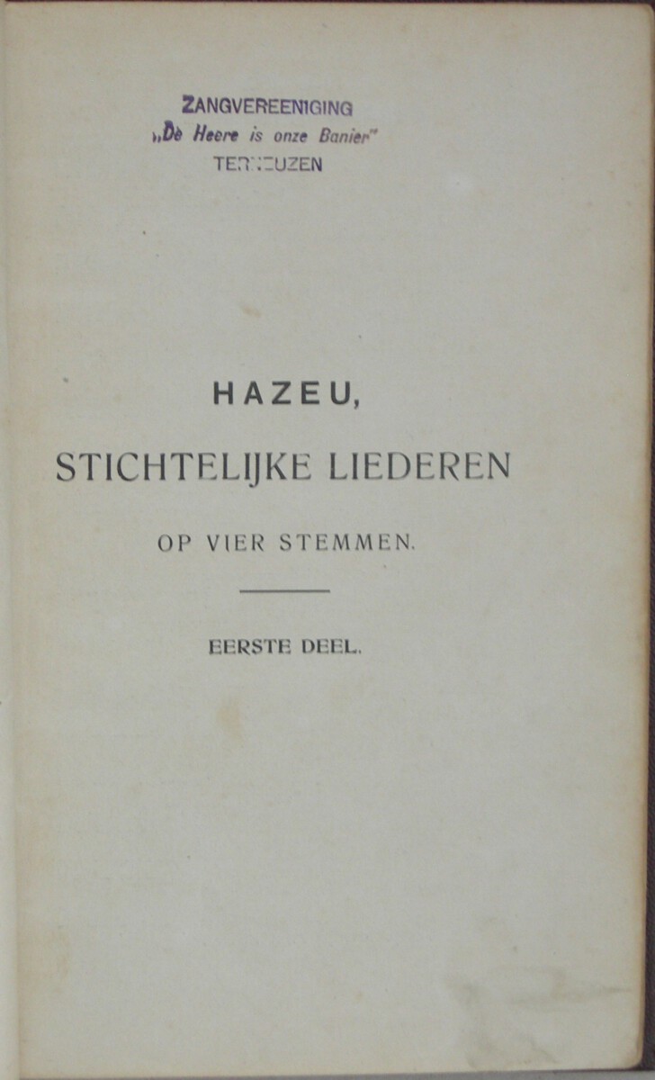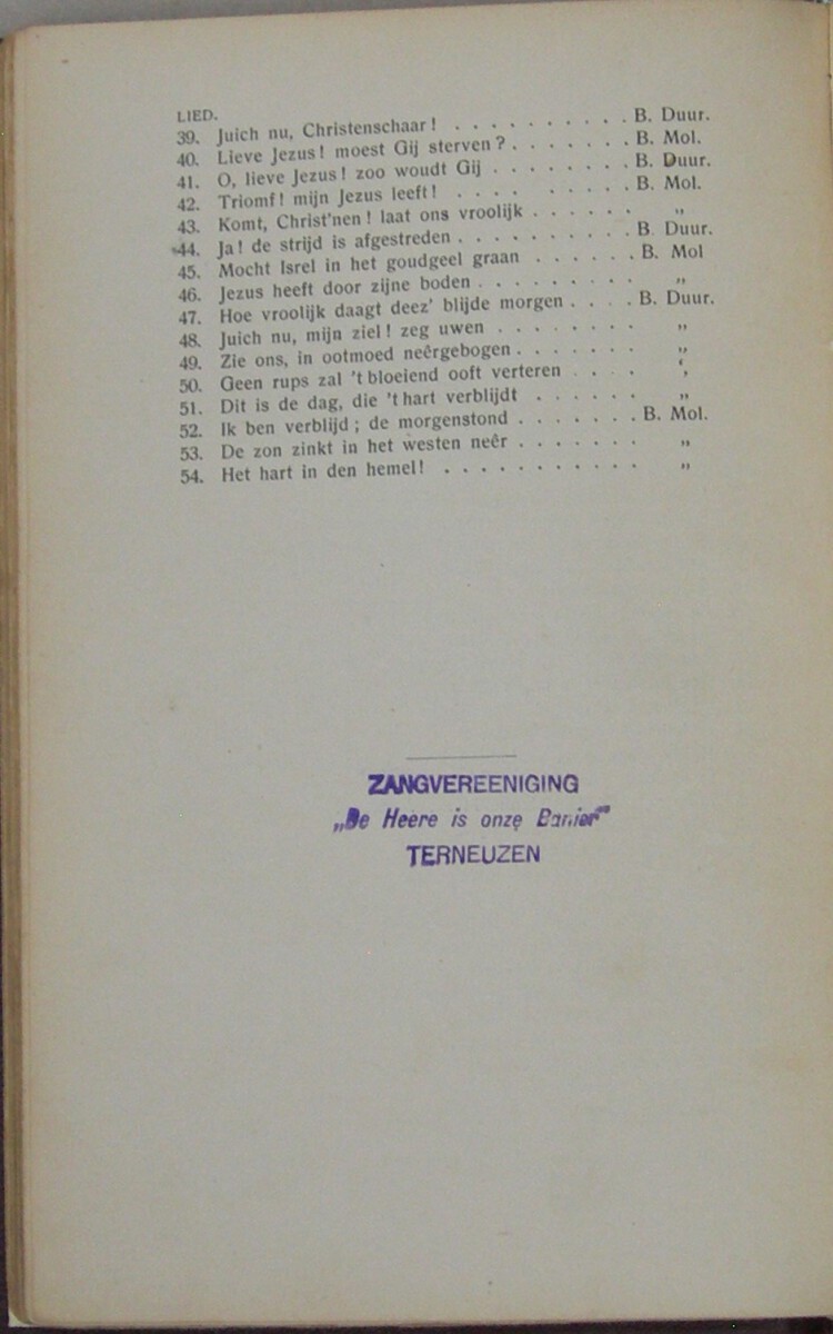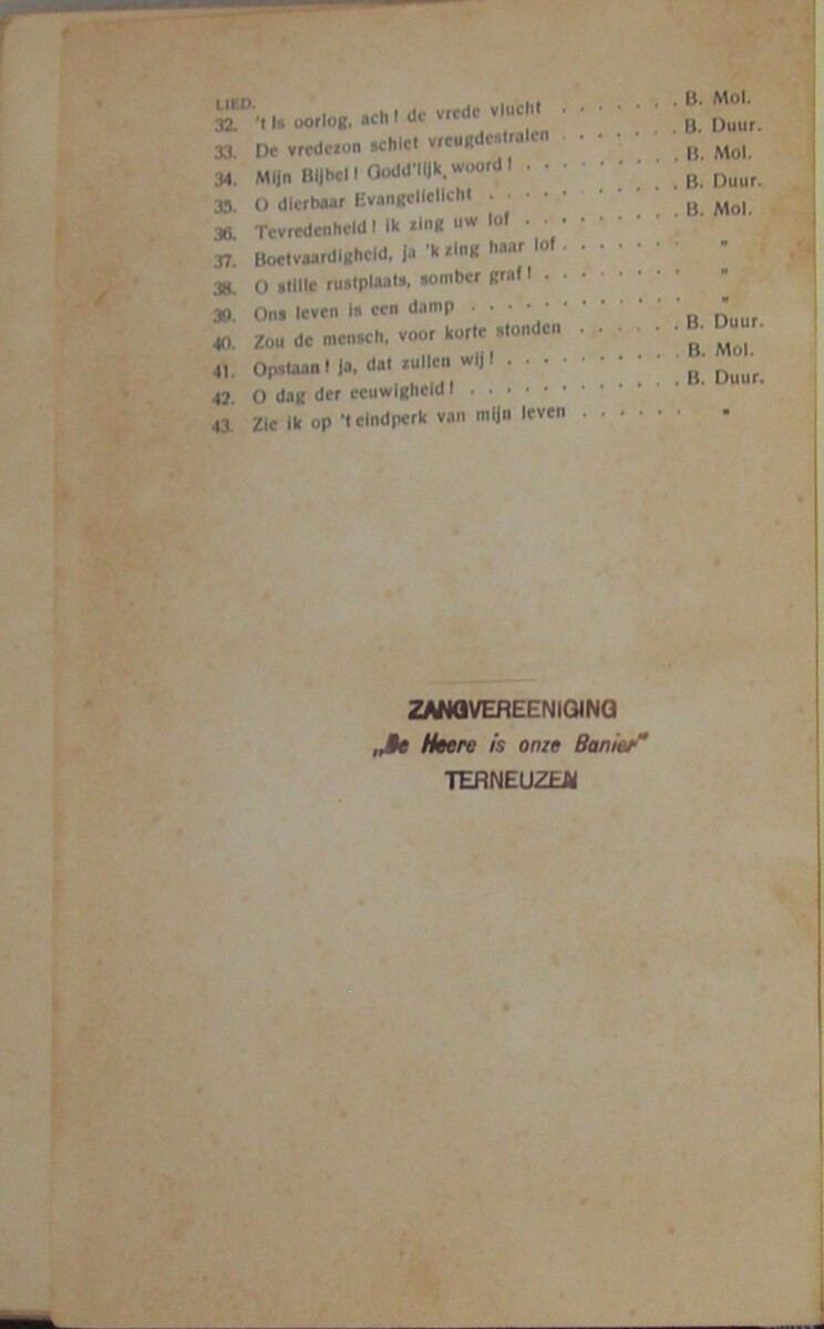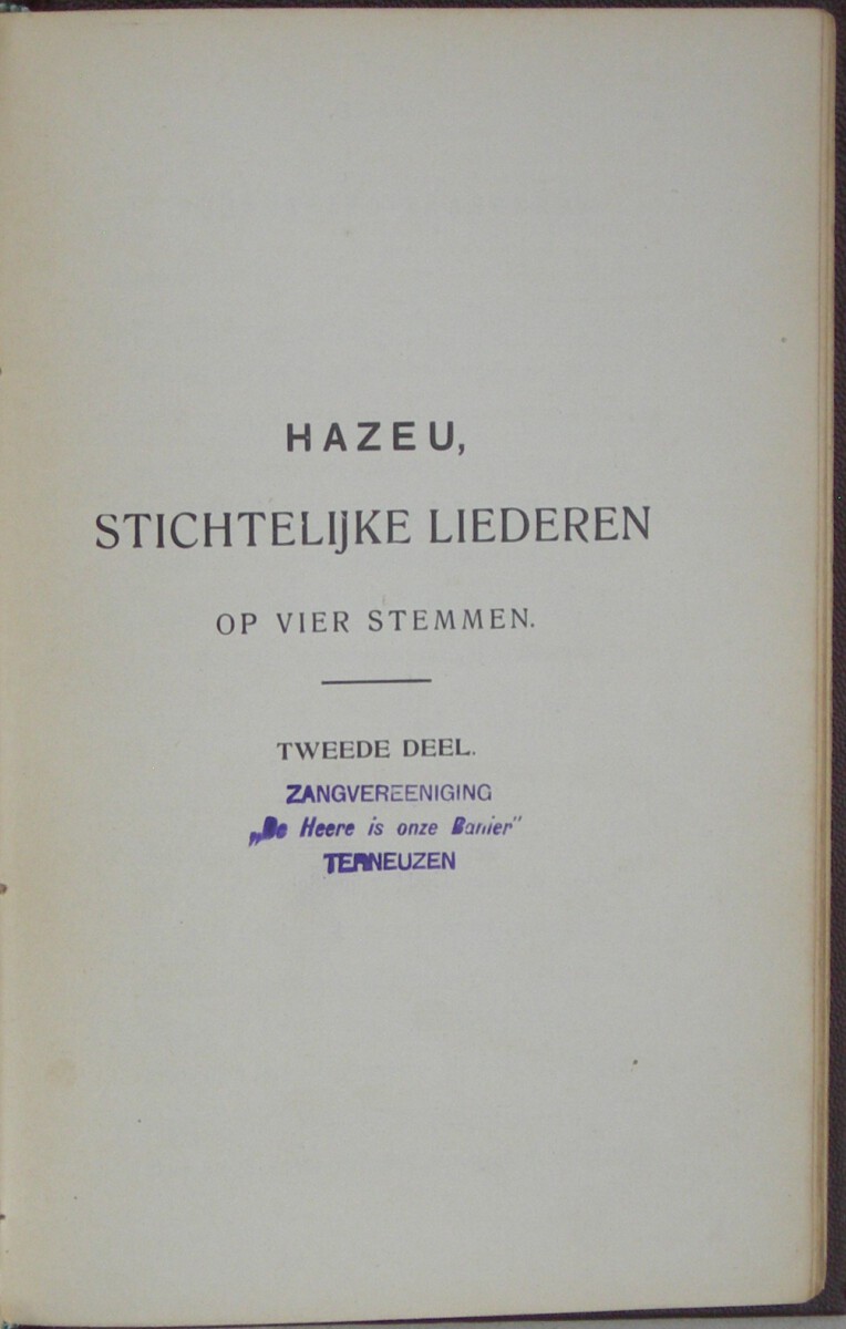 Opn. gebonden, leer met rugtitel, 4°; 111 / 87 blz. (met stempels van Zangvereeniging “De Heere is onze Banier” uit Terneuzen)