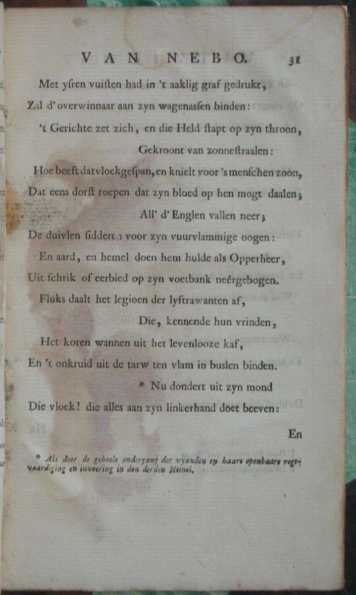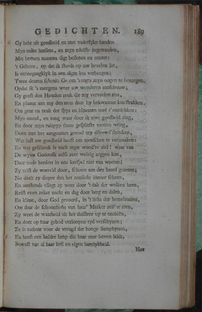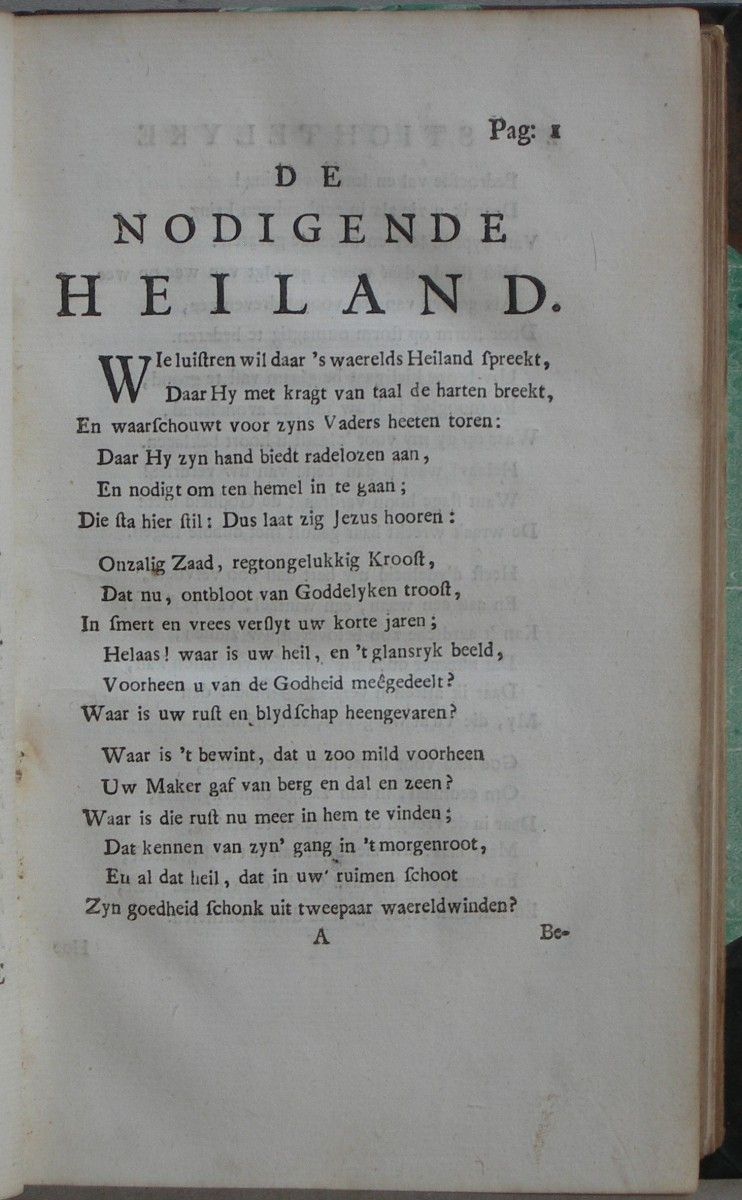Opn. gebonden in zeer fraaie, bestempelde half-leren (van Gent)band met ribben, 8o; deel 1: (titelprent, 26), 276, blz.; deel 2: (portret, 36), 276, (2) blz. (2e druk). Uitzicht op Nebo: 38 blz. (vanaf deel 2, blz. 211 vochtvlekken, voor het overige een zeer fraai exemplaar!)