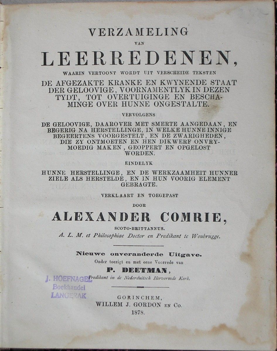 Verzameling van leerredenen, waar in vertoont wordt uit verscheide texten De Afgezakte Kranke en kwynende staat der Geloovigen, voornamentlyk in dezen Tydt, tot Overtuiginge en Beschaminge over hunne Ongestalte. Nieuwe en onveranderde Uitgave. Onder toezigt en met eene Voorrede van P. Deetman, Predikant te ’s Grevelduin Capelle.