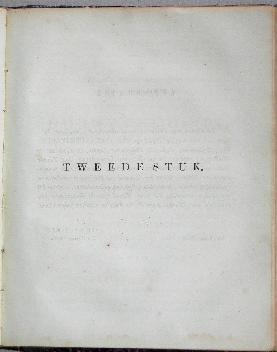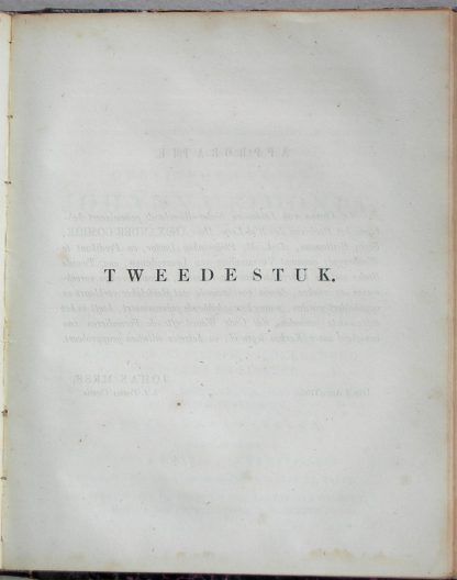 Orig. halfleer, 4o; Eerste stuk: (20), 194 blz. Tweede stuk: 195 – 376 blz. (marmers op de randen met lichte slijtage en op de 1e 2 blz. in de onderste marge een oude vochtvlek)
